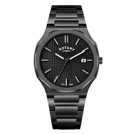 The Rotary Traditional blends wearability with considered design. Featuring a 40mm octagonal stainless steel case. Powered by a reliable quartz movement, its standout feature is the textured black dial - complimenting the gunmetal stainless steel case and integrated bracelet. Applied hour markers and slim hands give the watch a refined edge, while the curved case profile ensures a comfortable fit. A clean, contemporary classic made for any occasion.