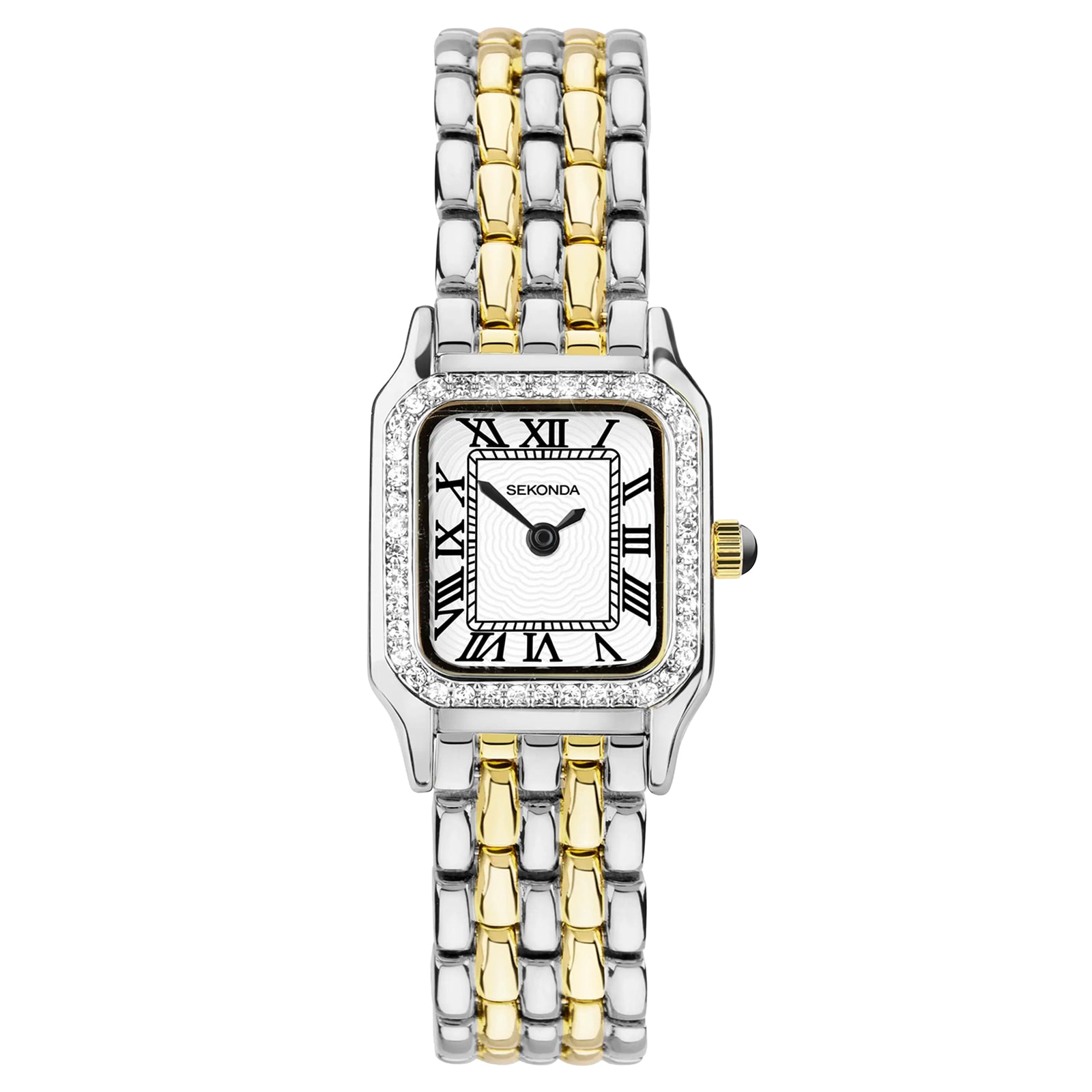 The Monica stone-set bezel watch strikes the perfect balance between everyday wear and timeless elegance. Its distinctive octagonal case frames a white guilloché dial with bold black Roman numerals, while a shimmering bezel set with 48 sparkling stones adds a touch of luxury. Complete with a classic metal bracelet and available in four stunning colourways, this versatile watch is designed to suit every wrist — and every occasion.