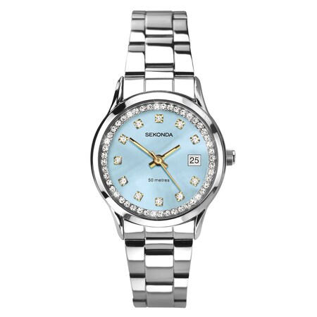 This watch has a round, silver ion-plated alloy case with a stone set, blue Mother-of-Pearl dial. Fastened with a stainless steel bracelet, features include a date display and up to 50 metres water resistance.