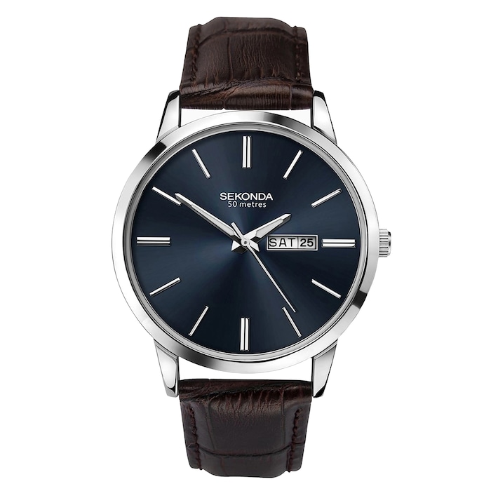 This watch features a silver coloured ionic plated case showcasing an attractive blue sunray dial with a day/date display. The watch is fastened with a classic dark brown croco grain leather strap and has water resistance to 50m.