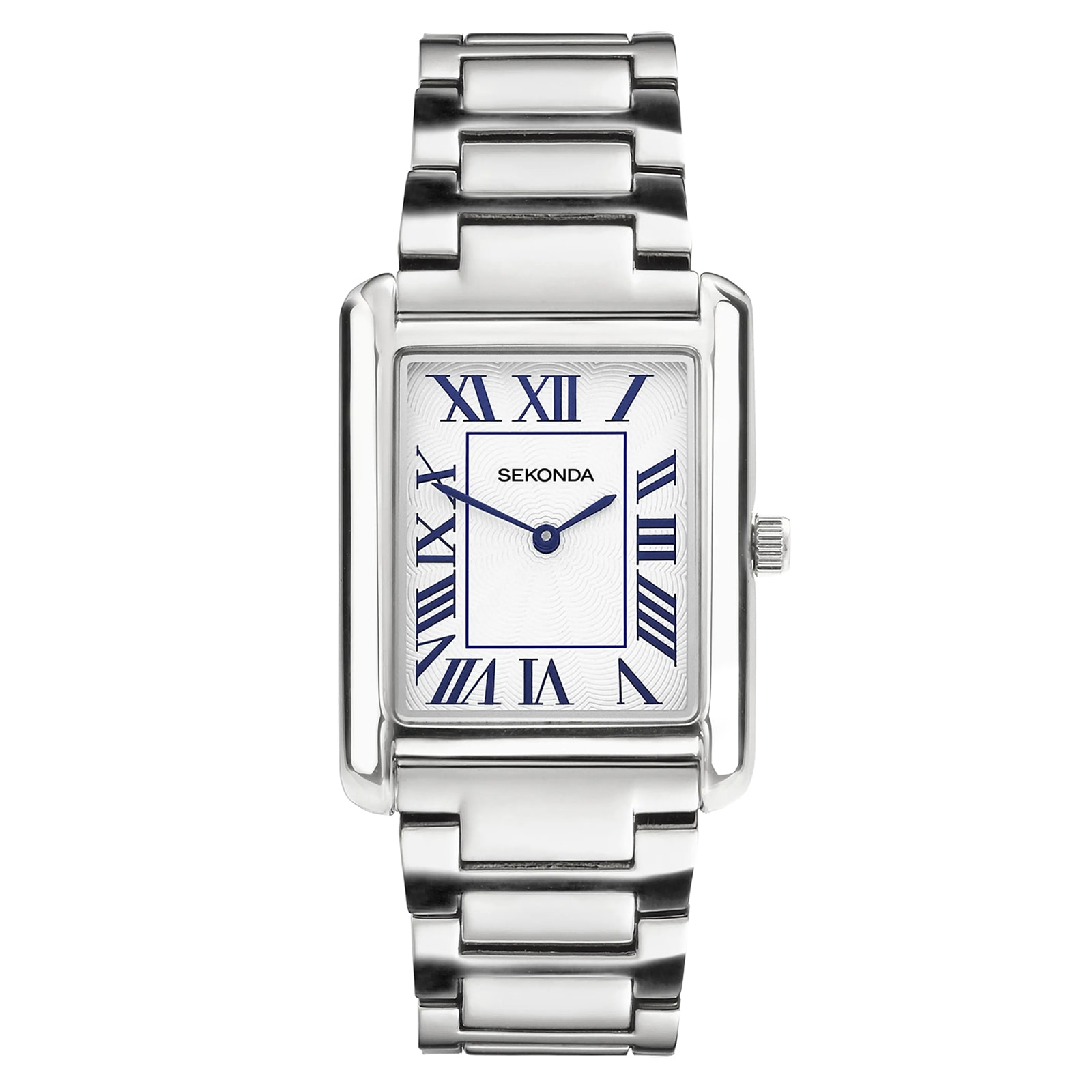 Blending vintage character with modern design, the Clement captures the enduring appeal of classic watches. Its bold rectangular case channels old-school charm, while the detailed guilloché dial, Roman numerals, and striking blue hands create a confident, refined aesthetic. Offered in silver or gold-plated finishes with your choice of bracelet or leather strap, the Clement delivers timeless style with a strong presence.