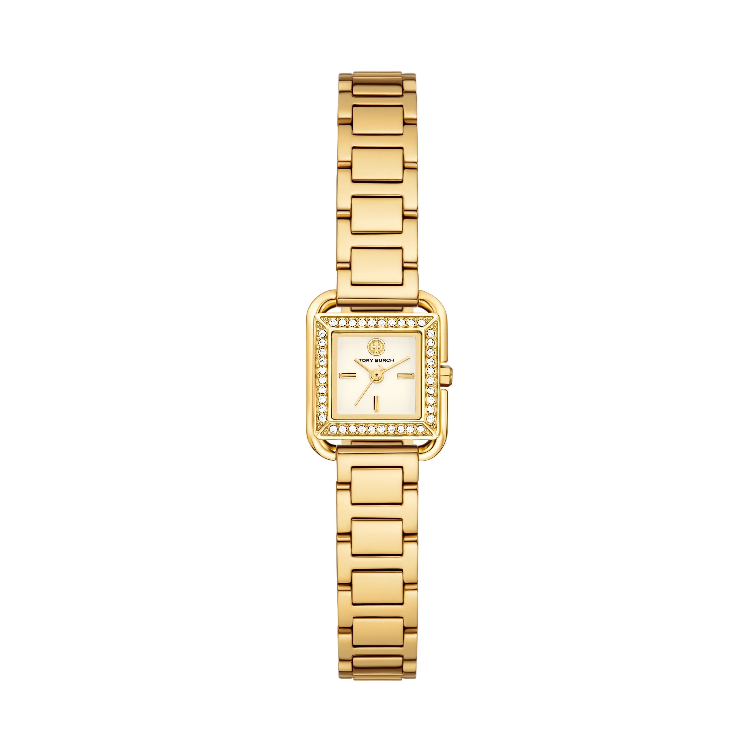 The small Kira watch features a crystal-embellished beveled case, set within a rounded border. Crafted in gold-tone stainless steel with an ivory dial, the H-link bracelet reinforces a retro sensibility.