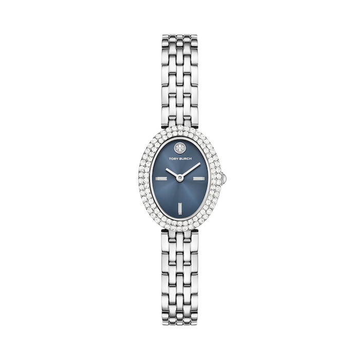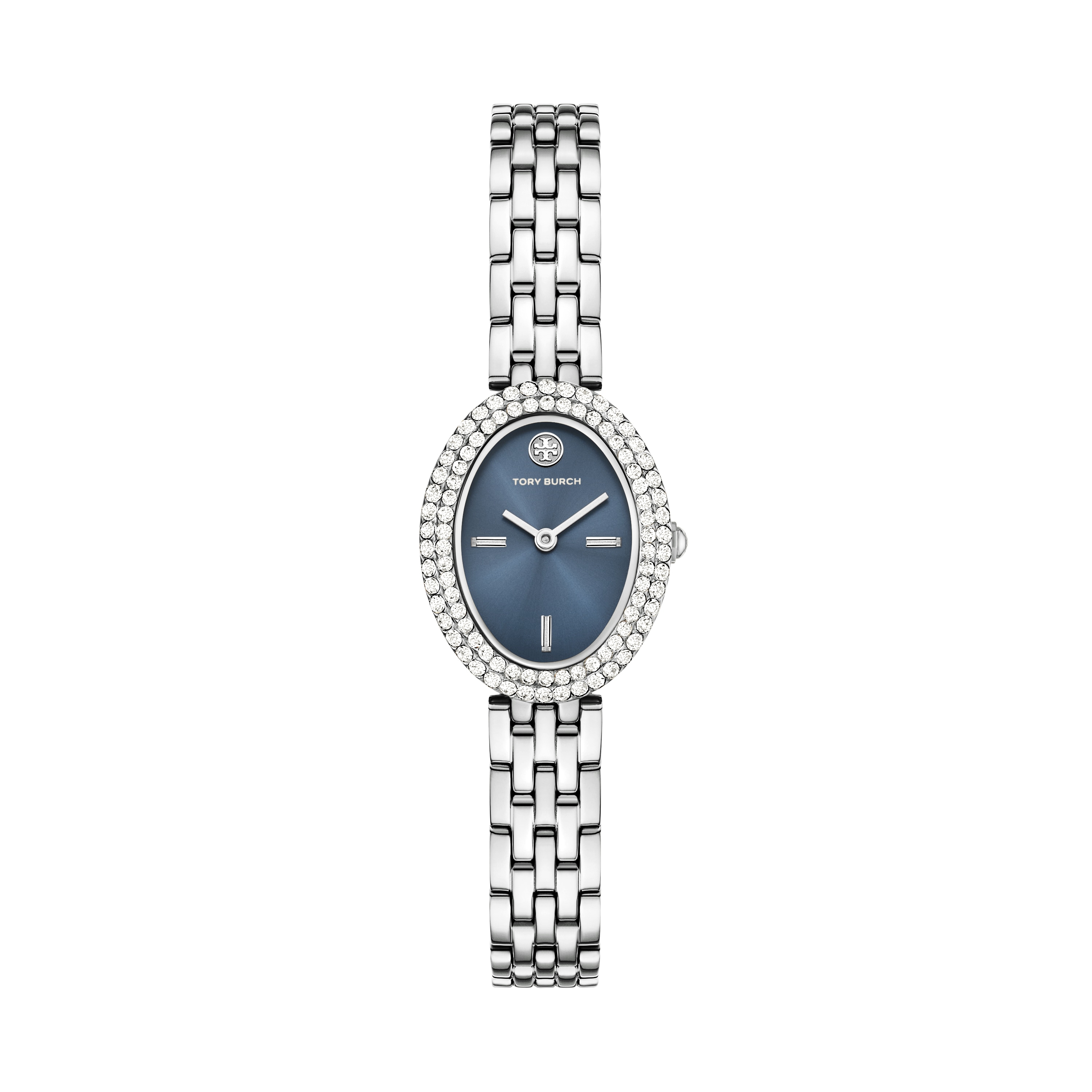 Delicate and jewelry-like, a blue dial is set within an oval-shaped case, outlined in pavé embellishments. The elegant design is complemented by a classic link bracelet and crafted in silver-tone stainless steel.