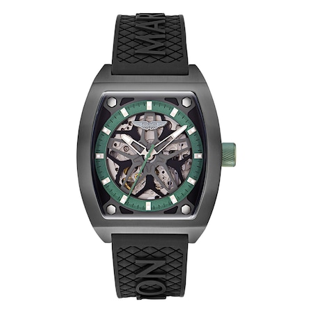 Bold by design, the TRG Automatic combines Seiko-powered mechanics with Aston Martin-inspired style. Its open skeleton dial, shaped after DBS GT Zagato wheel rims, reveals the movement beneath a lightweight titanium and carbon fiber case. The 41mm tonneau shape balances strength and comfort, while the performance-textured black silicone strap features a design echoing Aston Martin seat stitching. Finished with sapphire-coated glass, TRG is a perfect fusion of engineering and elegance. The transparent case back reveals the movement and a rotor in Aston Martin’s iconic colour Podium Green, adding a signature detail that links heritage and innovation.