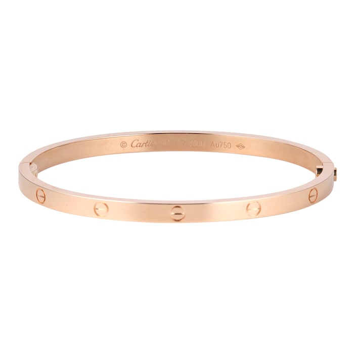 This Pre-Owned Cartier Love Bracelet in 18ct Rose Gold is from the Love collection. The bracelet includes the iconic screw motif displayed around the outer edge and features the screw and hinge fitting.