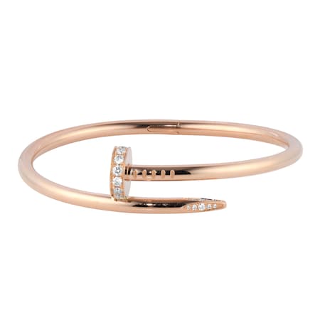 This Pre-Owned Cartier Juste Un Clou Bracelet in 18ct Rose Gold is in the style of a nail and features 27 round brilliant cut pavé diamonds set in the head and tip, totalling 0.54ct.