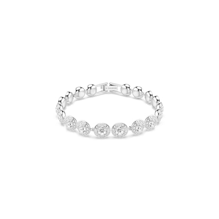 Wrap your wrist in light with this luminous Una Angelic bracelet. The rhodium plated design features individual links, each set with a brilliant central crystal and a halo of smaller round-cut crystals. An ethereally elegant choice that can be paired with matching pieces from the same family.