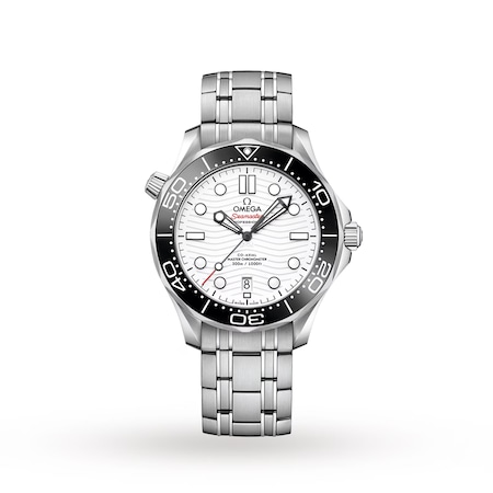 This 42mm model is crafted from stainless steel with a black ceramic bezel featuring a hard-wearing white enamel diving scale. The white ceramic dial is laser-engraved with the classic Seamaster wave pattern and a date window at 6 o’clock completes the classic design.